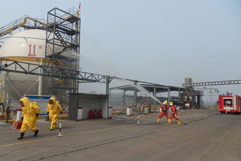 為檢驗(yàn)公司應(yīng)對(duì)安全事故的快速反應(yīng)和應(yīng)急處置能力,保證發(fā)生事故時(shí)能及時(shí)有效地進(jìn)行控制,最大限度地避免和減少財(cái)產(chǎn)損失、環(huán)境危害與社會(huì)影響。6月29日上午,公司在液氨罐區(qū)舉行了生產(chǎn)安全事故綜合應(yīng)急救援演練??h安監(jiān)局、縣環(huán)保局、縣總工會(huì)和公司相關(guān)領(lǐng)導(dǎo)及公司部分員工觀摩和參加了本次演練。 本次演練檢驗(yàn)了公司人員對(duì)綜合應(yīng)急預(yù)案的掌握程度,檢驗(yàn)了應(yīng)急救援人員對(duì)應(yīng)急救援設(shè)施和器材的熟練使用程度,各部門和應(yīng)急救援隊(duì)得到了實(shí)戰(zhàn)鍛煉的機(jī)會(huì),取得了良好的效果。同時(shí)檢驗(yàn)論證了公司生產(chǎn)安全事故綜合應(yīng)急救援預(yù)案符合實(shí)際,與事故應(yīng)急處置能力相適應(yīng),應(yīng)急響應(yīng)程序和保障措施等內(nèi)容切實(shí)可行。 公司安全生產(chǎn)副總逯劍要求公司各制造部、車間、崗位人員在下一步工作中繼續(xù)加強(qiáng)對(duì)應(yīng)急救援知識(shí)的學(xué)習(xí),平時(shí)加強(qiáng)演練,注重演練效果,熟練掌握應(yīng)急救援設(shè)施和器材的使用方法。在應(yīng)急情況下能夠沉著、冷靜,按照日常預(yù)案演練的程序迅速、恰當(dāng)?shù)夭扇〈胧?,控制減少事故危害影響,避免人員傷亡和設(shè)備財(cái)產(chǎn)的損失,確保企業(yè)的安全生產(chǎn)。 演練前,縣總工會(huì)領(lǐng)導(dǎo)為工作在一線的職工發(fā)放了安全帽,督促企業(yè)加強(qiáng)夏季高溫期間的職工勞動(dòng)保護(hù)工作。圖為演練現(xiàn)場(chǎng)。